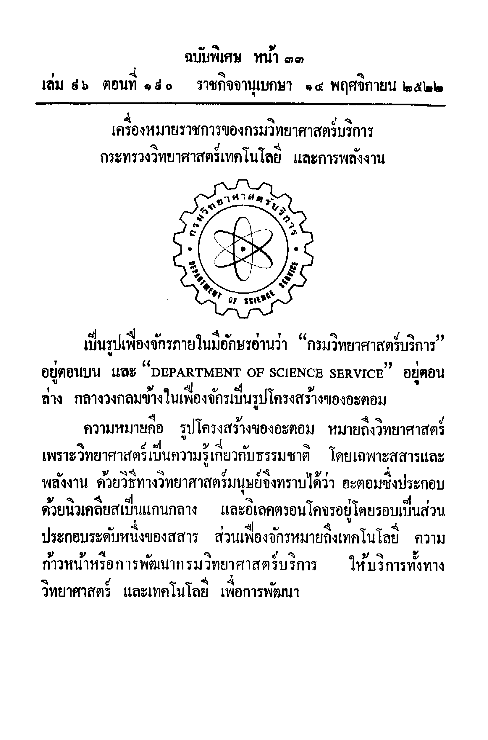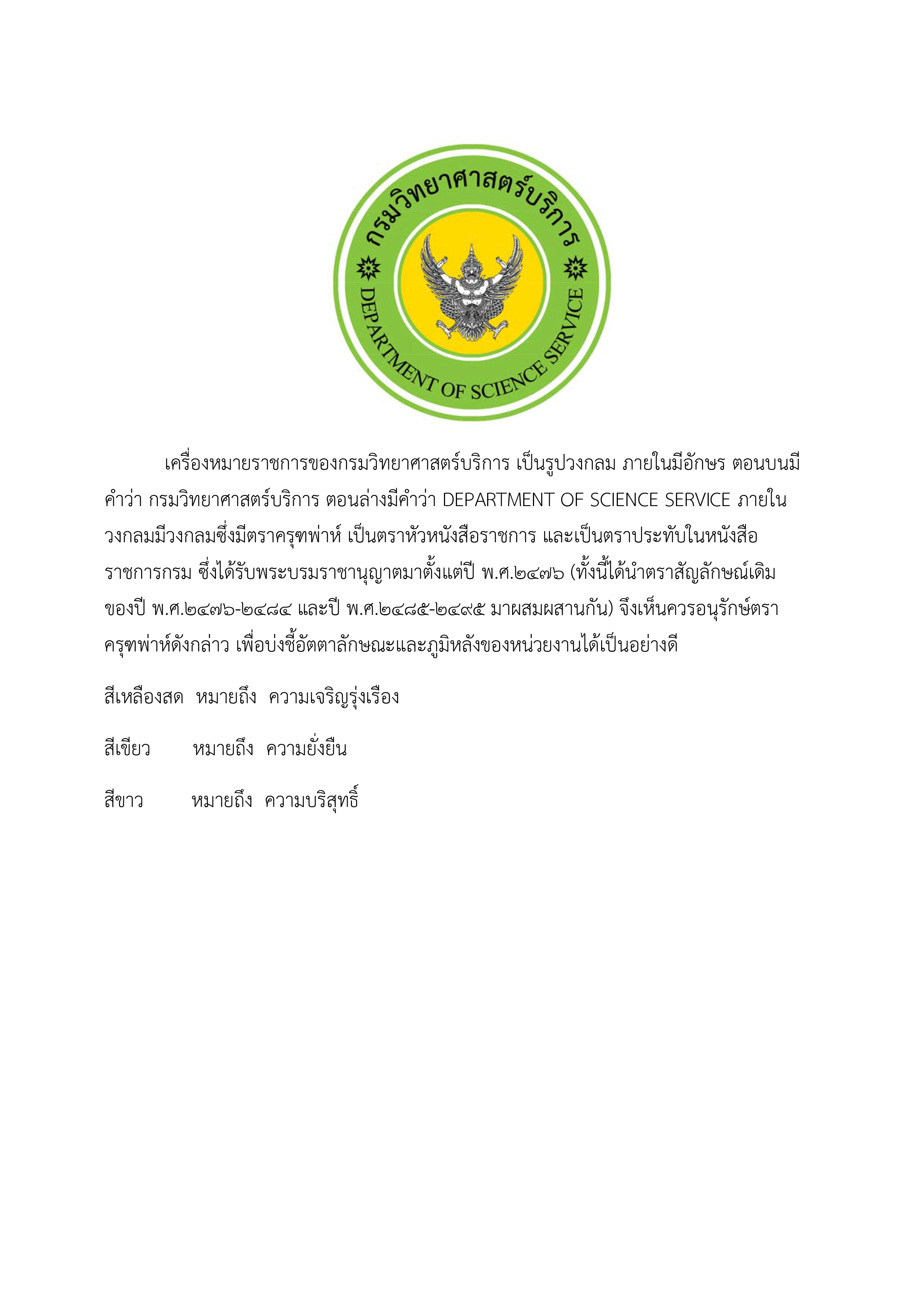 ประกาศสำนักนายกรัฐมนตรีเรื่องกำหนดภาพเครื่องหมายราชการของกรมวิทยาศาสตร์บริการ กระทรวงวิทยาศาสตร์เทคโนโลยี และการพลังงาน ราชกิจจานุเบกษา เล่ม ๙๖ ตอนที่ ๑๙๐ ฉบบพิเศษ หน้า ๓๒-๓๓ วันที่ ๑๔ พฤศจิกายน ๒๕๒๒