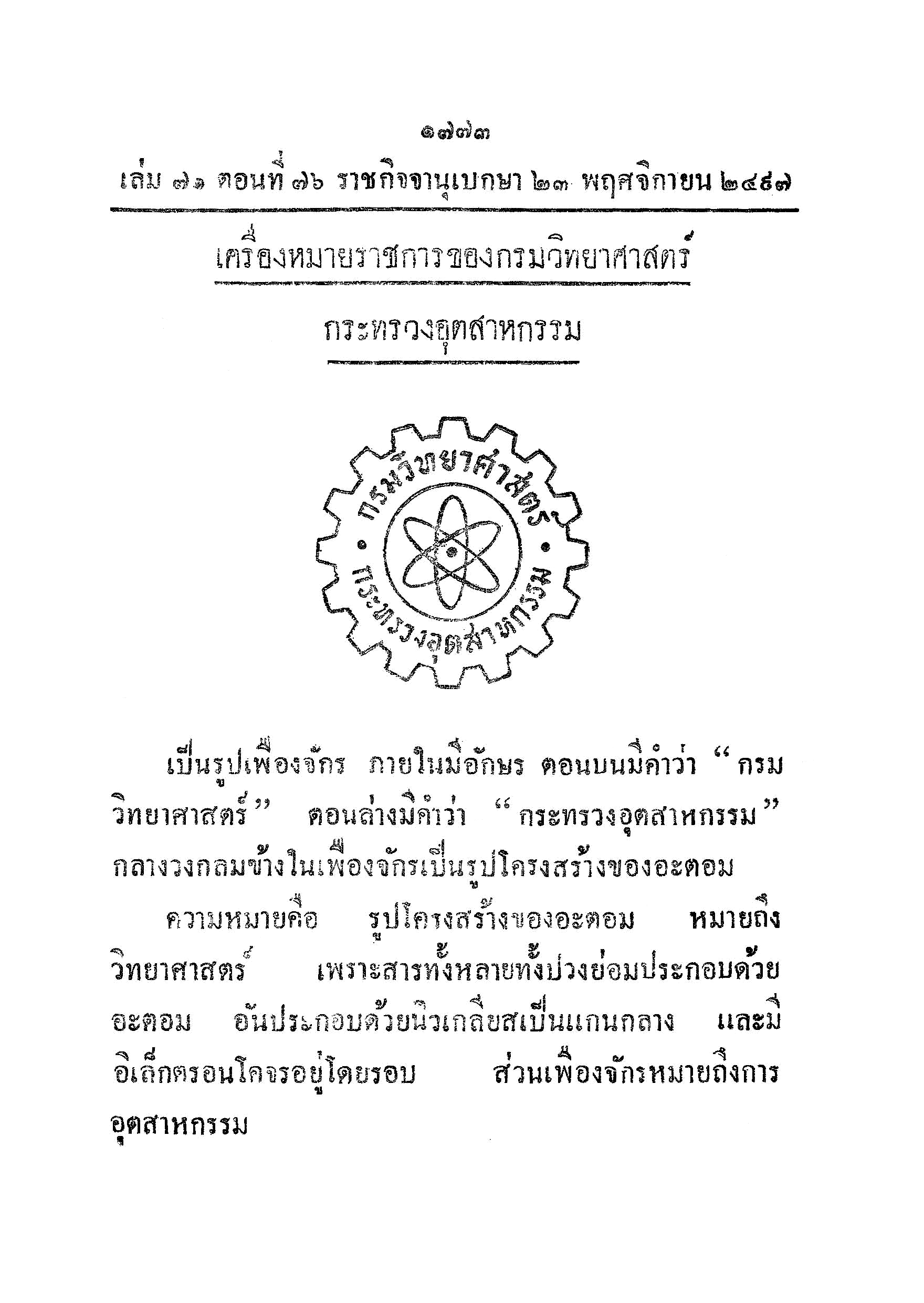 เครื่องหมายราชการของกรมวิทยาศาสตร์ กระทรวงอุตสาหกรรม ประกาศในราชการกิจจานุเบกษา เล่ม ๗๑ ตอนที่ ๗๖ หน้า ๑๗๗๓ วันที่ ๒๓ พฤศจิกายน ๒๔๙๗