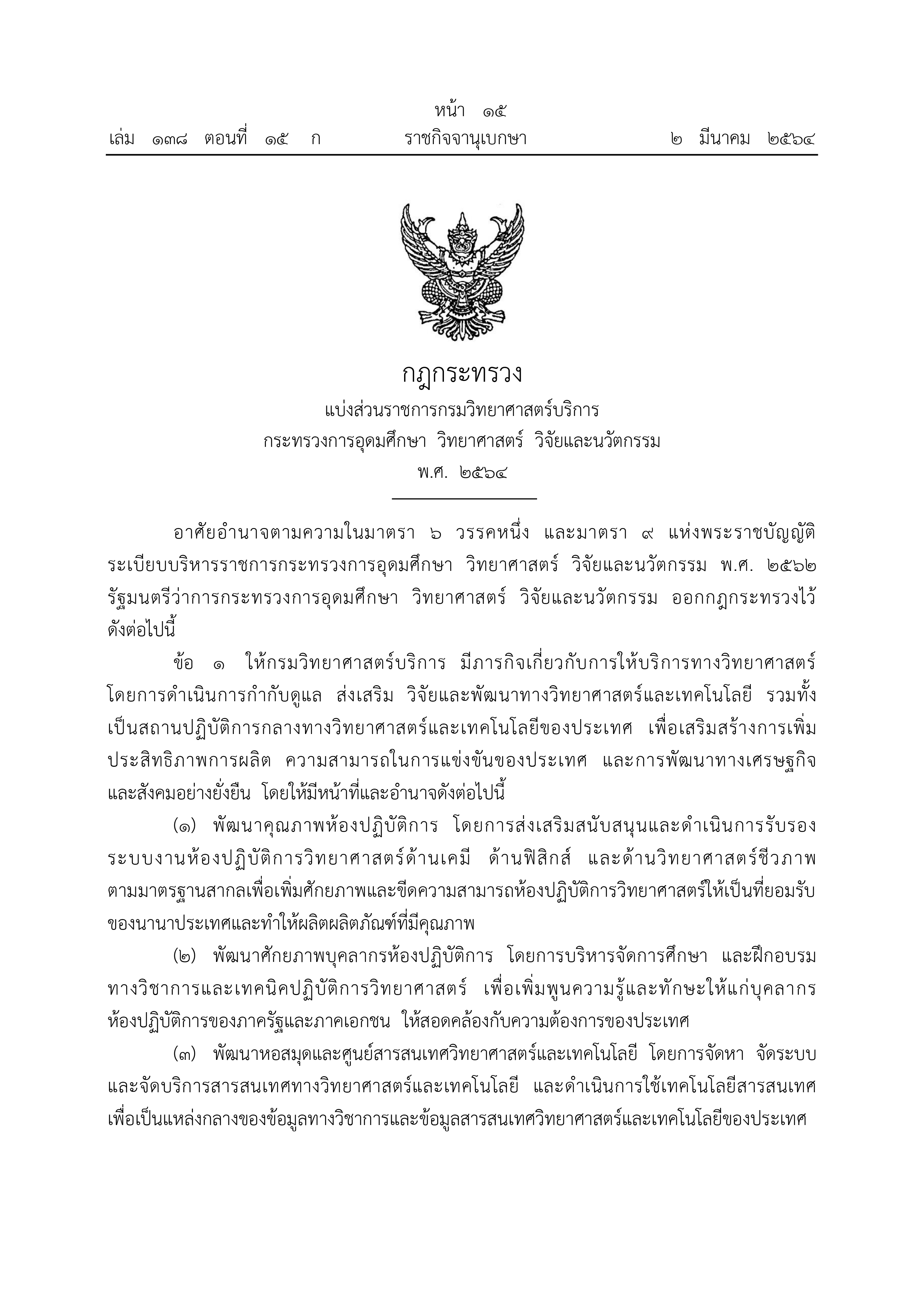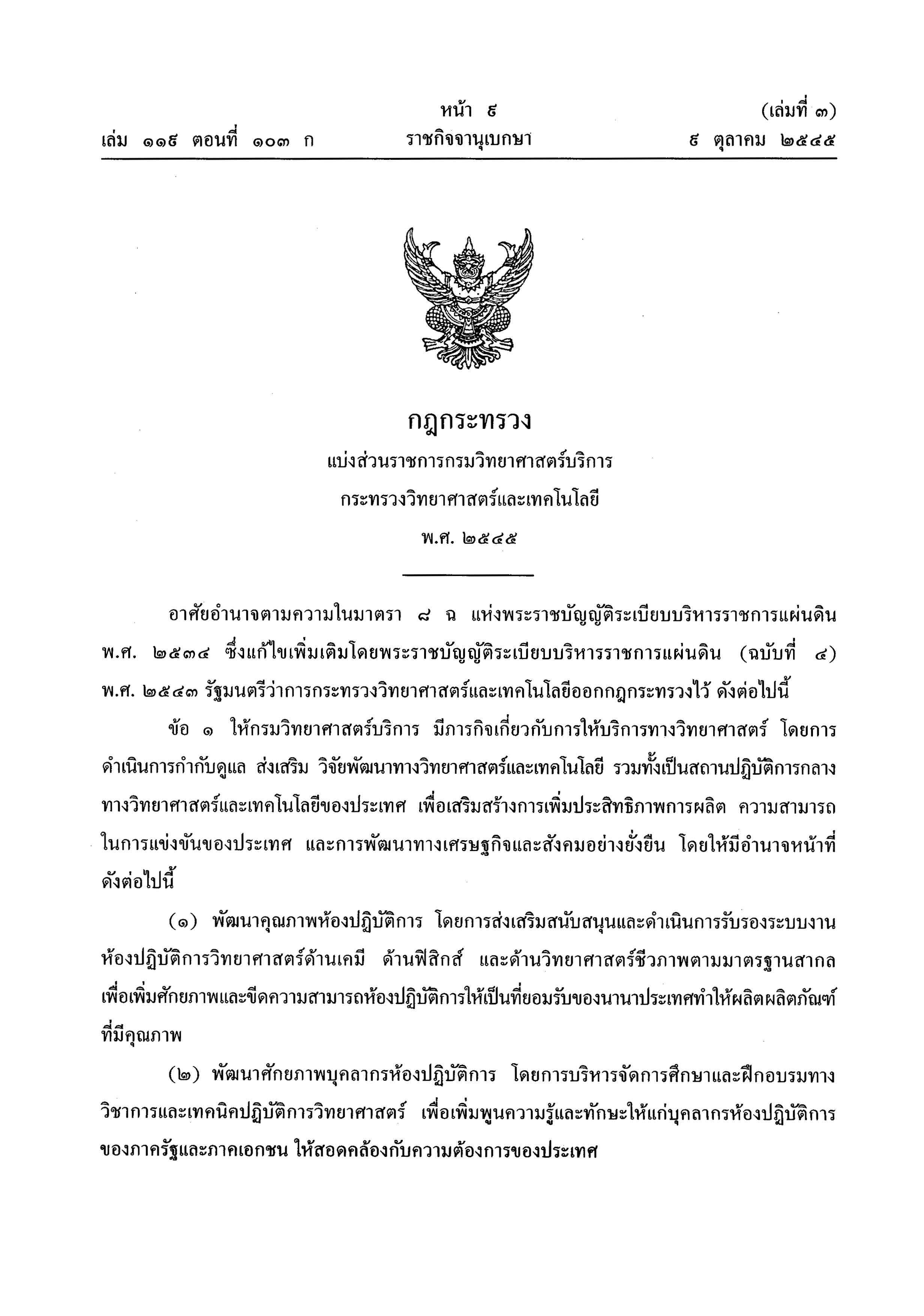 ข้อ ๑ ให้กรมวิทยาศาสตร์บริการ มีภารกิจเกี่ยวกับการให้บริการทางวิทยาศาสตร์ โดยการกำกับดูแล ส่งเสริม วิจัยทางวิทยาศาสตร์และเทคโนโลยี รวมทั้งเป็นสถานปฏิบัติการกลางทางวิทยาศาสตร์และเทคโนโลยีของประเทศ เพื่อเสริมสร้างการเพิ่มประสิทธิภาพการผลิต ความสามารถในการแข่งขันของประเทศ และการพัฒนาทางเศรษฐกิจอย่างยั่งยืนข้อ ๒ ให้แบ่งส่วนราชการกรมวิทยาศาสตร์บริการ ดังนี้๑. สำนักเลขานุการกรม๒. สำนักเทนโนโลยีชุมชน๓. สำนักบริหารและรับรองห้องปฏิบัติการ๔. สำนักพัฒนาศักยภาพนักวิทยาศาสตร์ห้องปฏิบัติการ๕. สำนักหอสมุดและศูนย์สารสนเทศวิทยาศาสตร์และเทคโนโลยีข้อ ๓ ให้มีกลุ่มปฏิบัติงานด้านวิชาการเพื่อปฏิบัติงานวิชาการทางวิทยาศาสตร์และเทคโนโลยี ขึ้นตรงต่ออธิบดี ดังนี้๑. โครงการเคมี๒. โครงการฟิสิกส์และวิศวกรรม๓. โครงการวิทยาศาสตร์ชีวภาพ